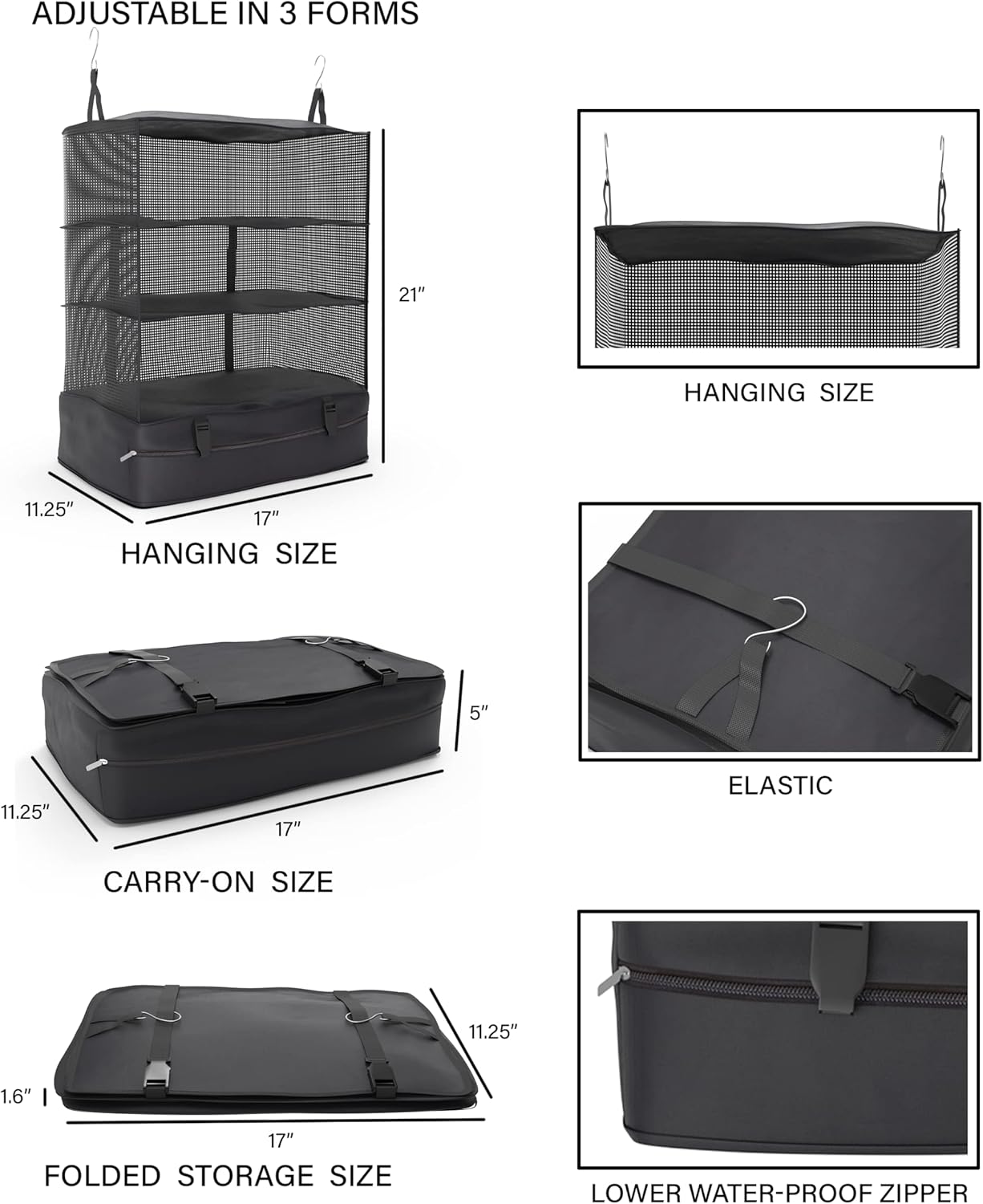 Diseñado con 3 compartimientos plegables, material impermeable y un gancho de acero inoxidable, te permite guardar, transportar y colgar fácilmente toda tu ropa y accesorios sin necesidad de desempacar.